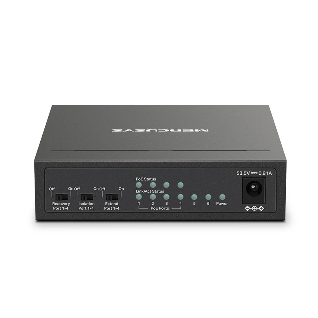 El Mercusys MS106LP es un switch de escritorio no gestionado de alta eficiencia, diseñado para llevar energía y datos a través de un solo cable. Es la solución ideal para instalaciones de seguridad y redes domésticas o de pequeñas oficinas que requieren alimentar dispositivos PoE de forma económica y fiable.