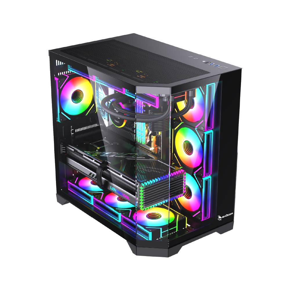 El Exodia Panel Zro redefine la refrigeración con su diseño optimizado para un máximo flujo de aire y una estética inigualable en color negro. Este chasis espacioso es compatible con placas base ATX, mATX e ITX, y soporta componentes de alta gama, incluyendo GPUs de hasta 400mm. Viene equipado con 7 ventiladores ARGB preinstalados para un rendimiento térmico superior y una iluminación espectacular.