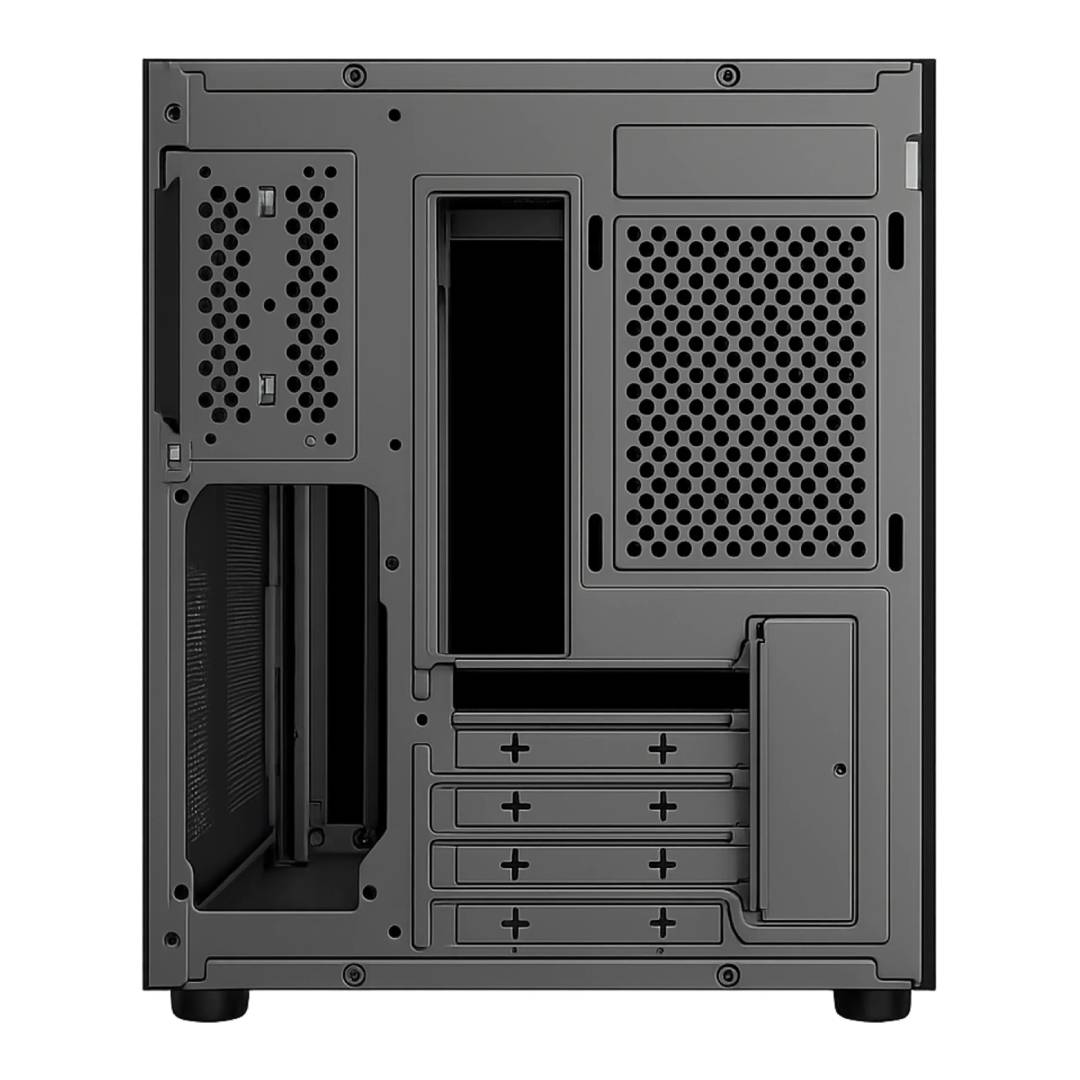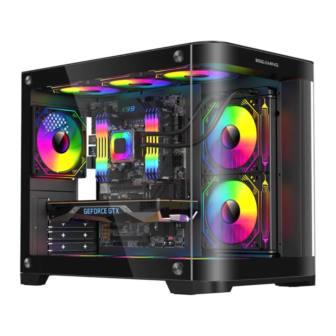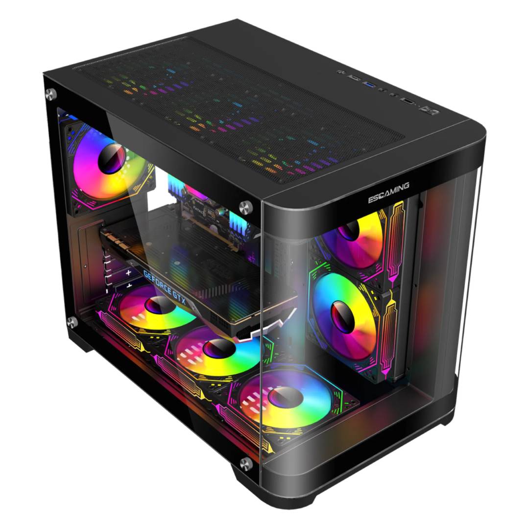 El Gabinete EsGaming Viper – Black es una opción diseñada para usuarios que buscan un gabinete compacto y funcional para configuraciones con placas base Micro ATX. Destaca por su diseño con panel lateral de vidrio templado que permite una visualización clara del interior, además de contar con iluminación RGB controlada manualmente desde el propio gabinete. Su estructura ofrece un buen soporte para componentes de tamaño medio, con espacio para tarjetas gráficas de hasta 340 mm y disipadores de CPU de hasta 160 mm de altura.