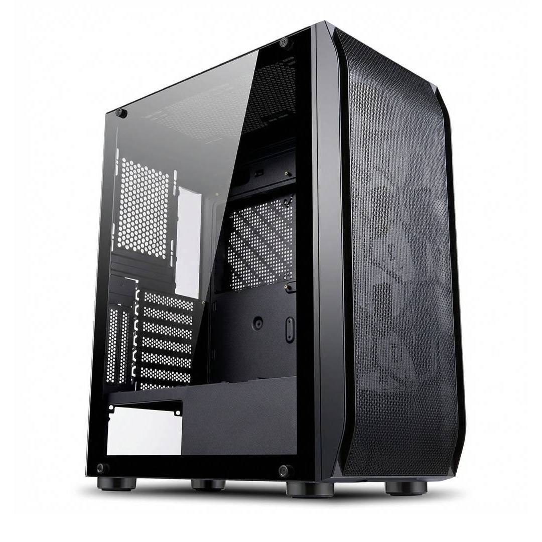 Diseño y materiales: Panel lateral de vidrio templado, panel frontal ABS mesh para alta ventilación y filtros antipolvo metálicos imantados en la parte superior.