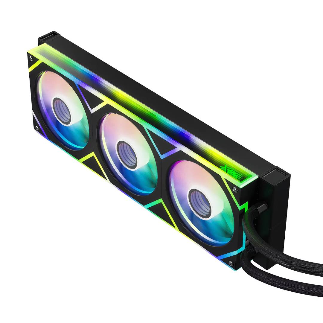 Radiador de aluminio de 360 mm con 3 ventiladores ARGB de 120 mm y control PWM para un flujo de aire máximo de 58 CFM.