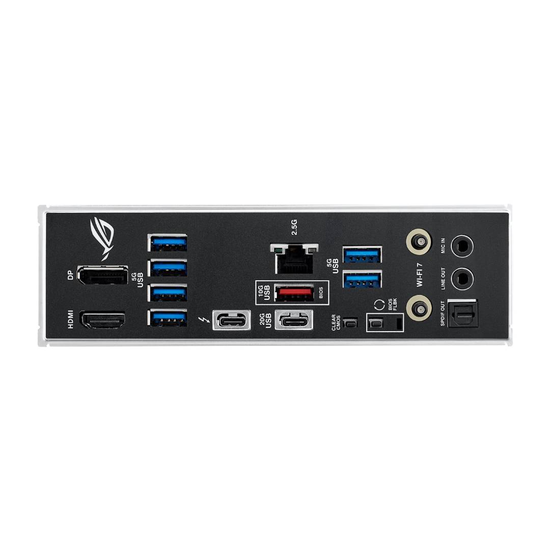 Conectividad avanzada: Wi-Fi 7 (802.11be) con antena Q-Antenna, Ethernet Intel 2.5 GbE, y puerto Thunderbolt™ 4 USB Type-C con soporte para DisplayPort y transferencia de datos ultrarrápida.