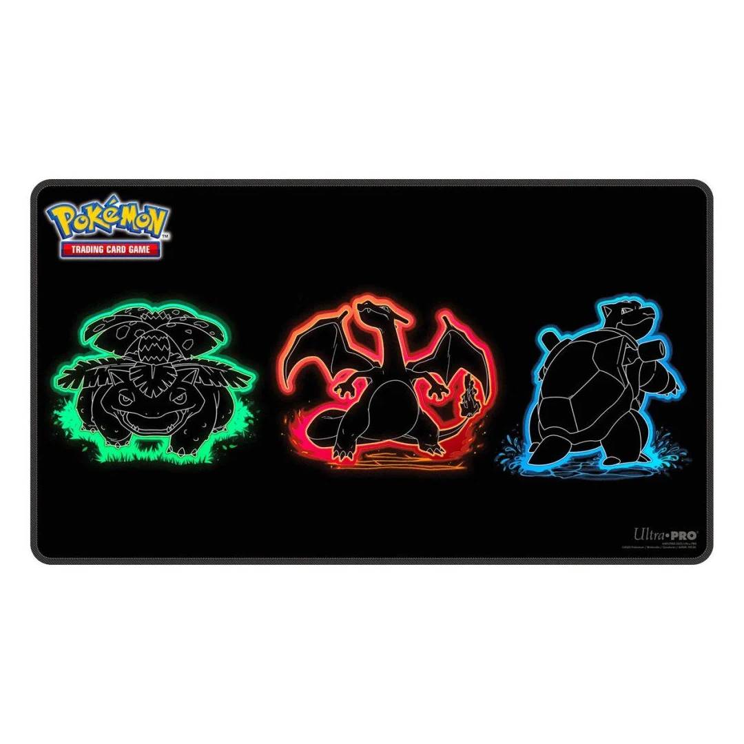 Arte Vibrante: El tapete presenta ilustraciones audaces e inspiradas en luces de neón de los icónicos Pokémon iniciales de Kanto: Venusaur, Charizard y Blastoise.