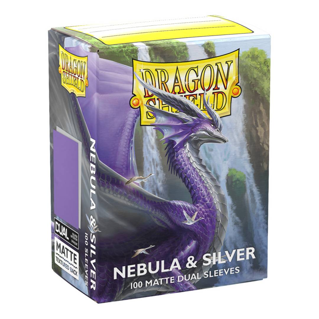 Los protectores Dragon Shield Dual Matte Nebula & Silver (EAN: 5706569150754) presentan un color morado cósmico profundo en el exterior, manteniendo la estructura de doble capa de la serie Dual.