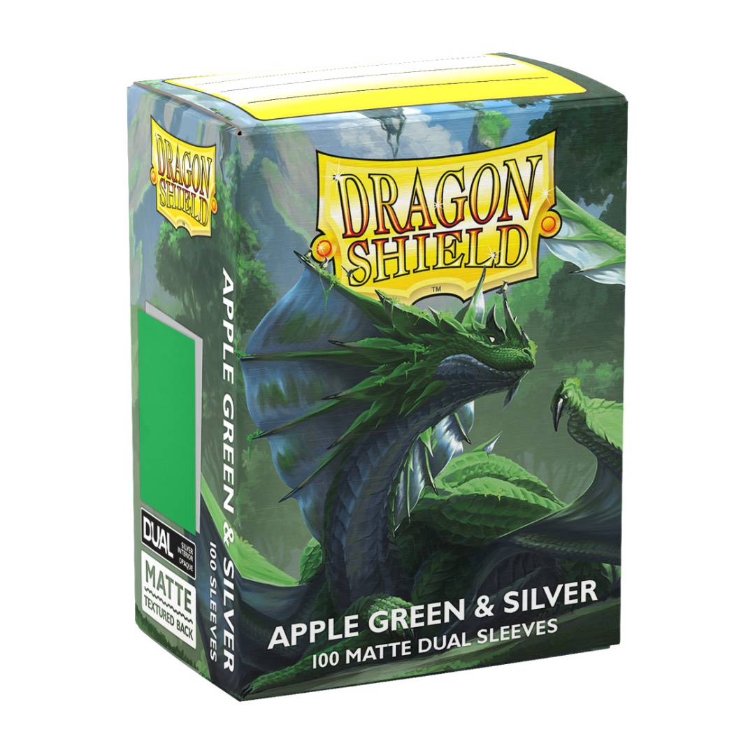 Los protectores Dragon Shield Dual Matte Apple Green & Silver (EAN: 5706569150730) destacan por su color verde manzana vibrante en el exterior, combinado con el interior negro característico de la serie Dual.