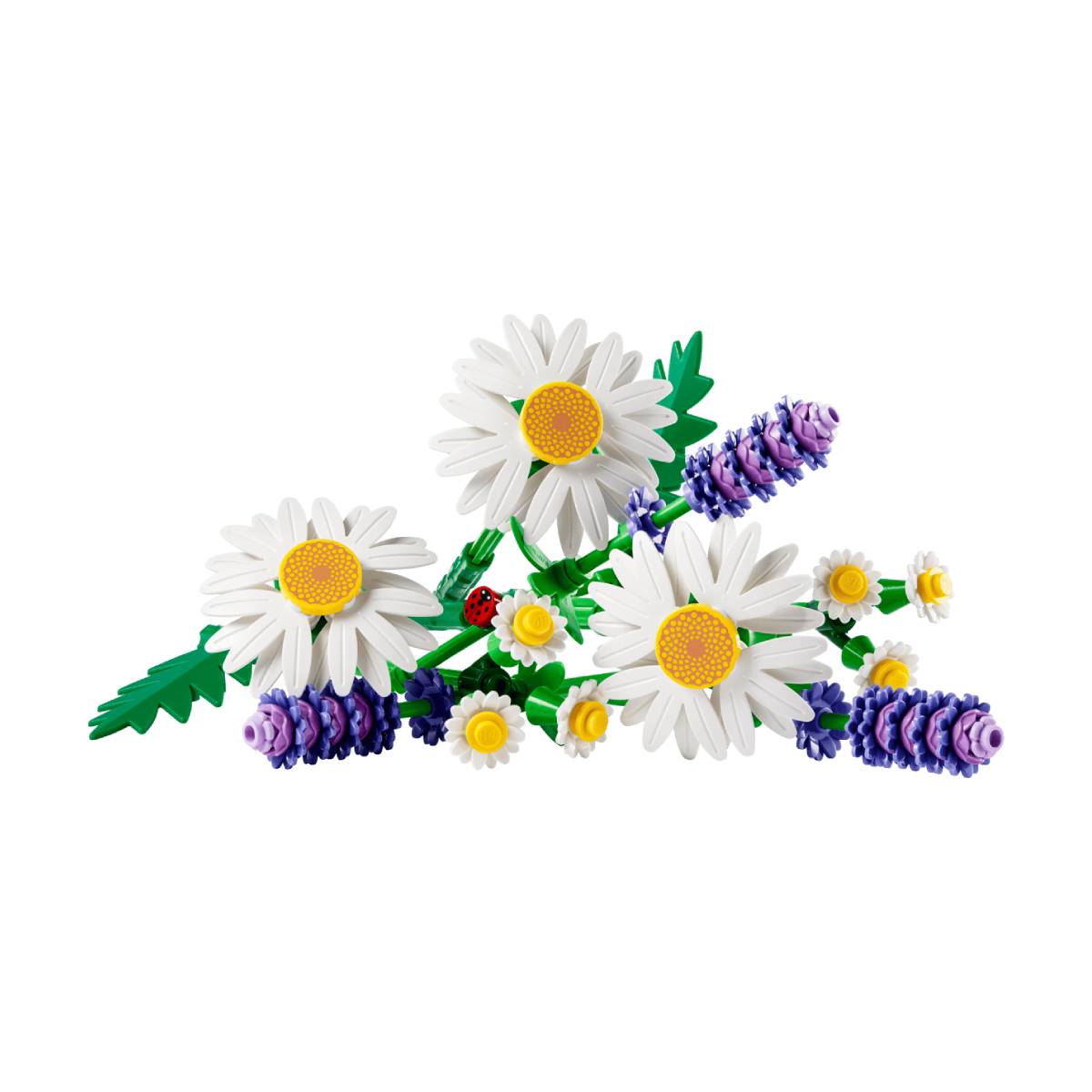 Ramo de flores LEGO: Los aprendices de floristas se lo pasarán genial construyendo 3 margaritas grandes, 2 tallos con margaritas pequeñas, 3 relajantes flores de lavanda y vibrantes tallos verdes.