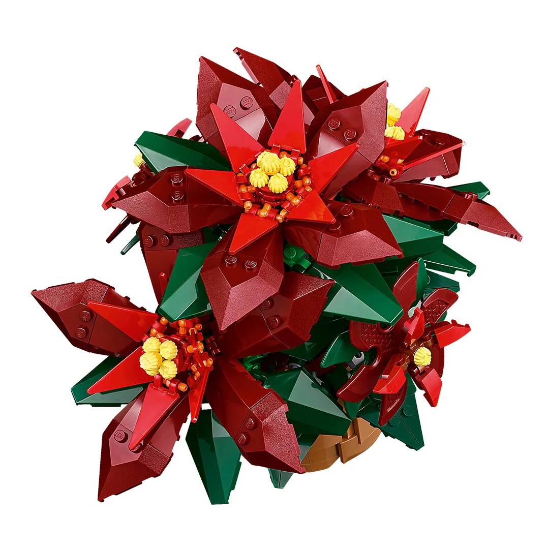 Planta LEGO articulada: Esta interpretación LEGO de esta clásica planta navideña está articulada y cuenta con hojas verdes y 5 grupos centrales (brácteas) en forma de estrella de hojas rojas con ciatos amarillos.