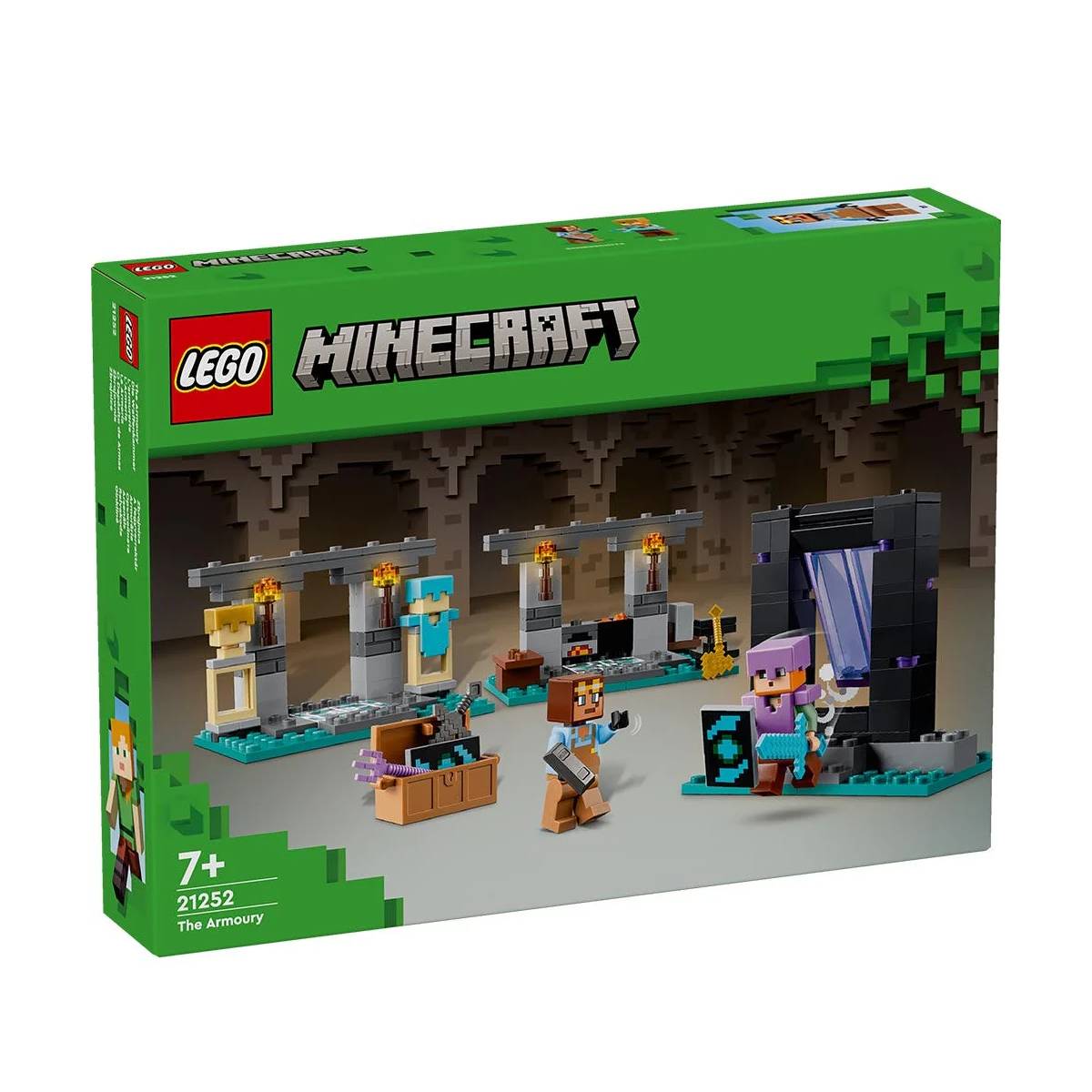 A los jugadores de Minecraft® de 7 años o más les encantará jugar en el mundo real con los elementos y Minecraft del set La Armería (21252). Este kit de construcción LEGO® Minecraft, una fantástica idea de regalo para niños y niñas, les ofrece la puerta de entrada perfecta a las aventuras Minecraft. Este juguete infantil construible incluye 2 conocidas figuras: la heroína de acción Minecraft Alex, con su escudo y su espada de diamante, y el armero. Puedes explorar 3 entornos: la zona de trabajo, con un yunque, un horno, una piedra de afilar y un caldero lleno de lava; la sala de exposición de armaduras, cuyo cofre contiene un hacha dorada, un tridente encantado, una espada de netherita, un casco y otros recursos Minecraft; y el portal del Nether, con su entrada de puertas batientes hacia la nueva aventura de los jugadores. El juguete Minecraft puede combinarse con otros sets LEGO Minecraft, como La Emboscada en el Portal del Nether (21255), a la venta por separado.