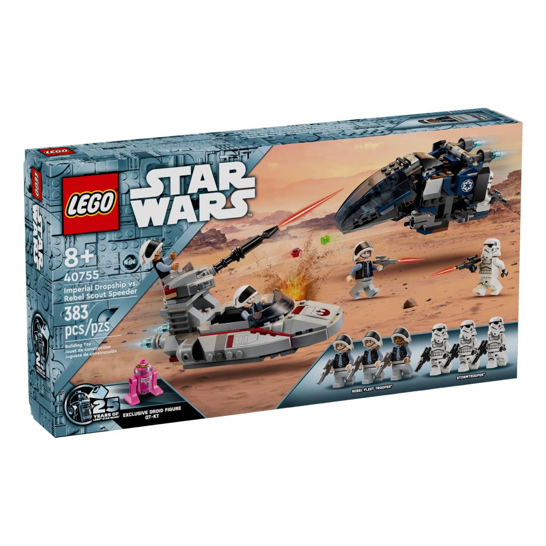 Nave de descenso imperial: Cuenta con cabina abatible para una minifigura LEGO, 2 cañones que disparan, alas y motores giratorios, además de una plataforma de transporte de tropas desmontable con espacio para 2 minifiguras LEGO.