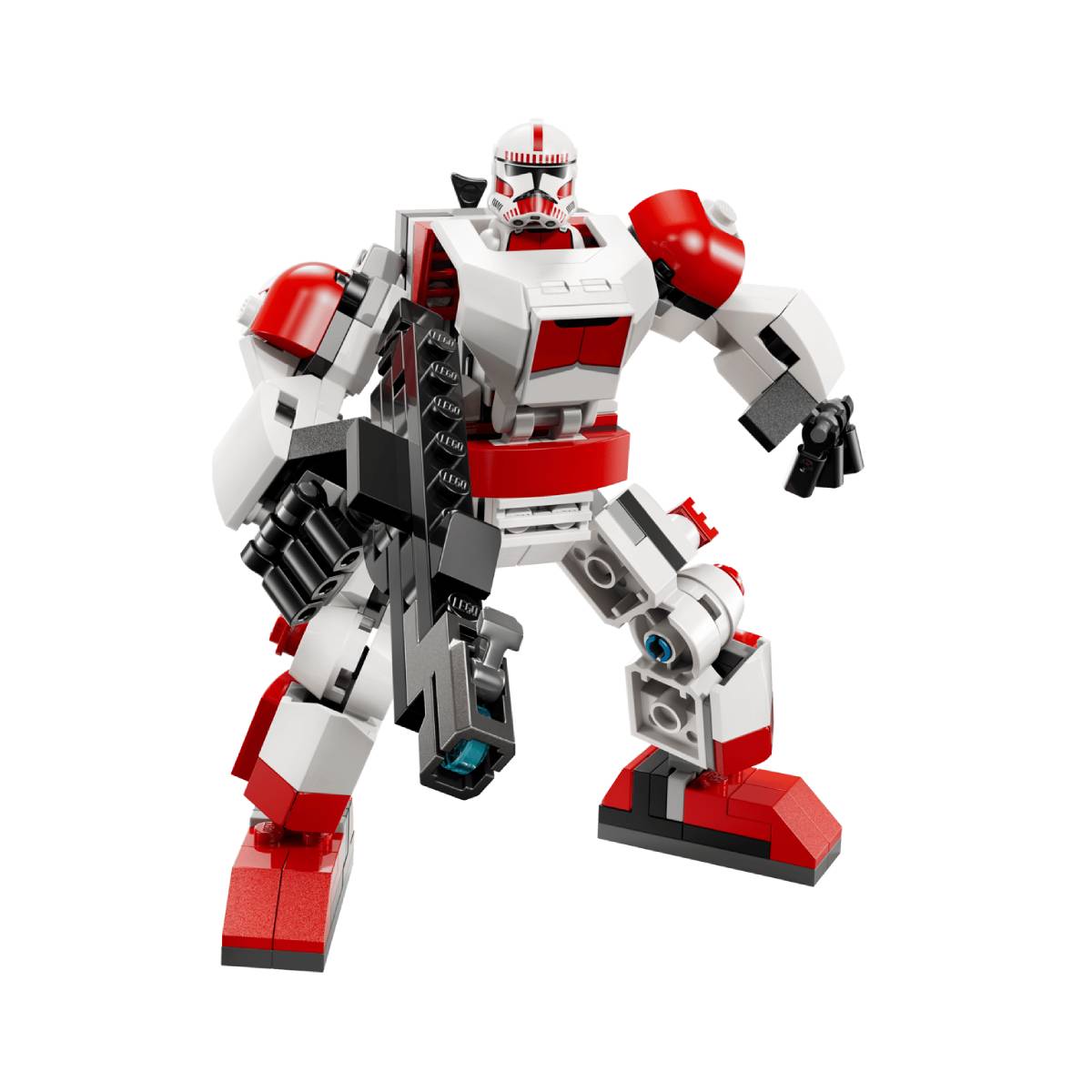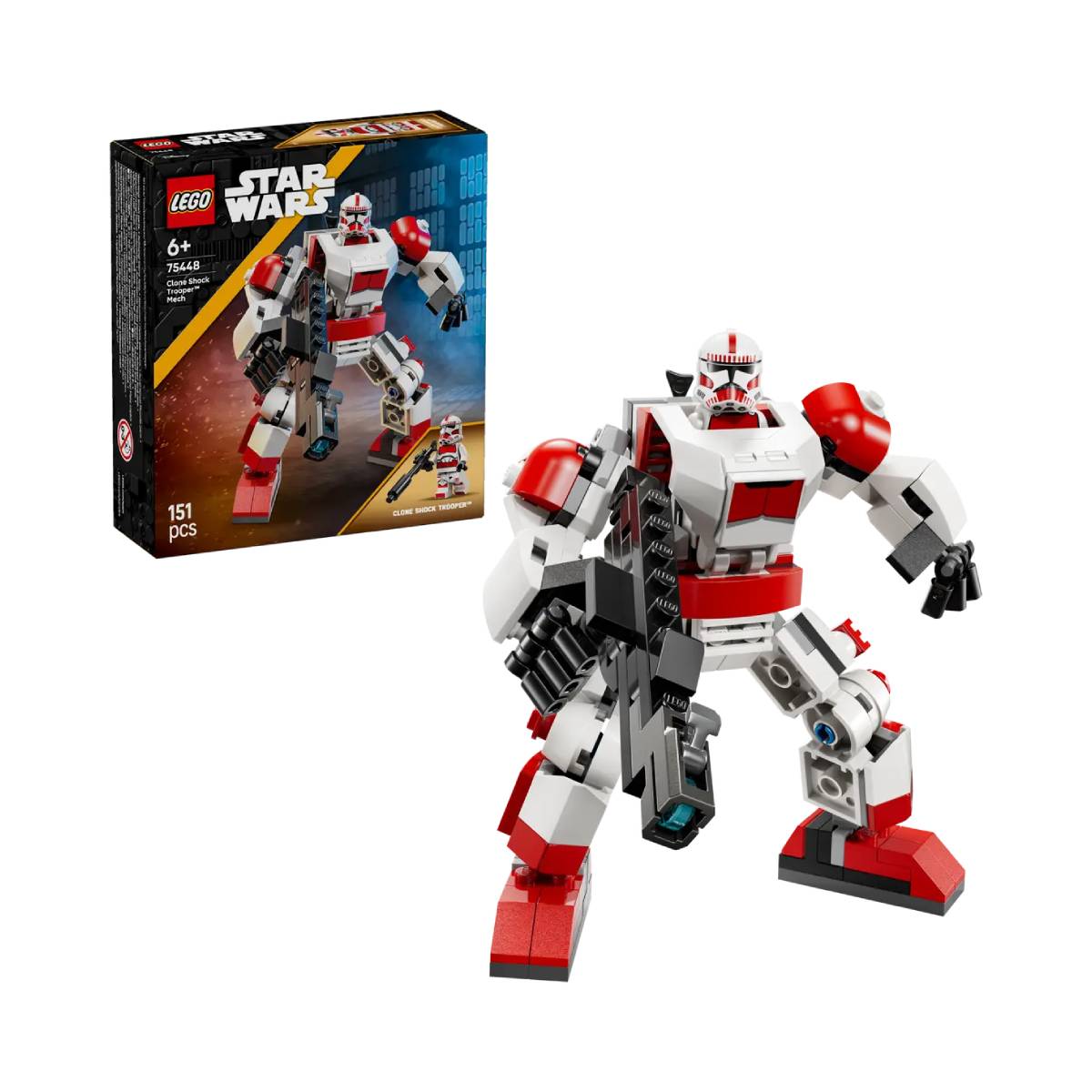 Coloca la minifigura del soldado clon de choque en la cabina del mech y engancha su fusil bláster a la espalda. Ajusta los brazos, las piernas y los pies del mech para crear posturas de combate dinámicas. Ponle el gran fusil bláster en las manos y activa su cañón para vivir intensas batallas imaginarias. Con su armadura en los colores rojo y blanco característicos de los soldados clon de choque, este mech también queda genial expuesto en la habitación de los niños.