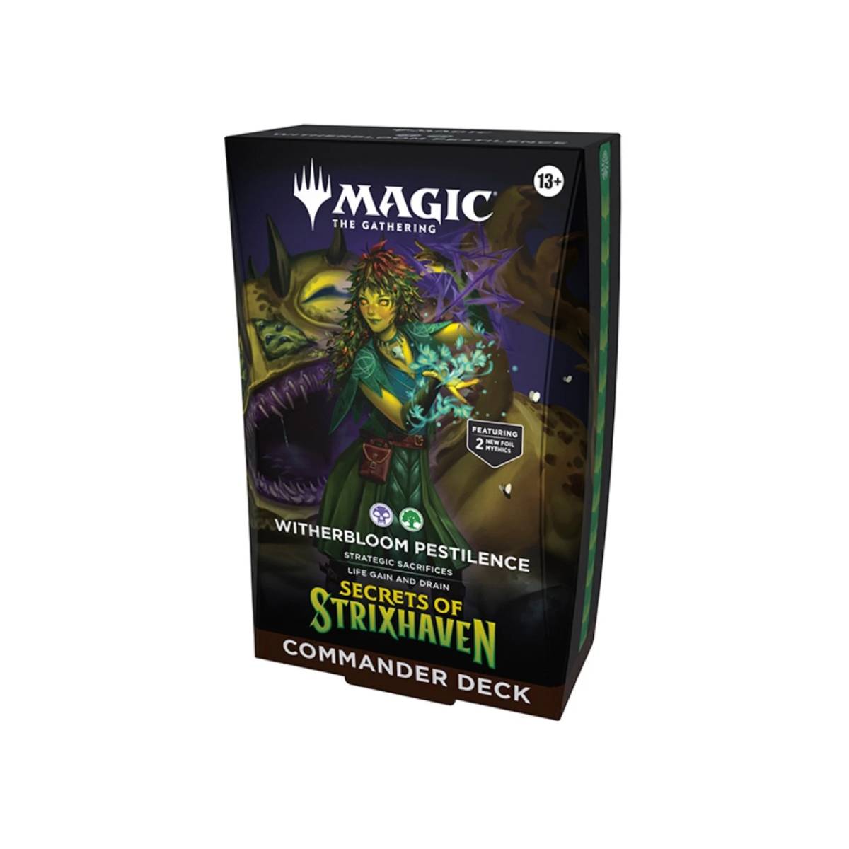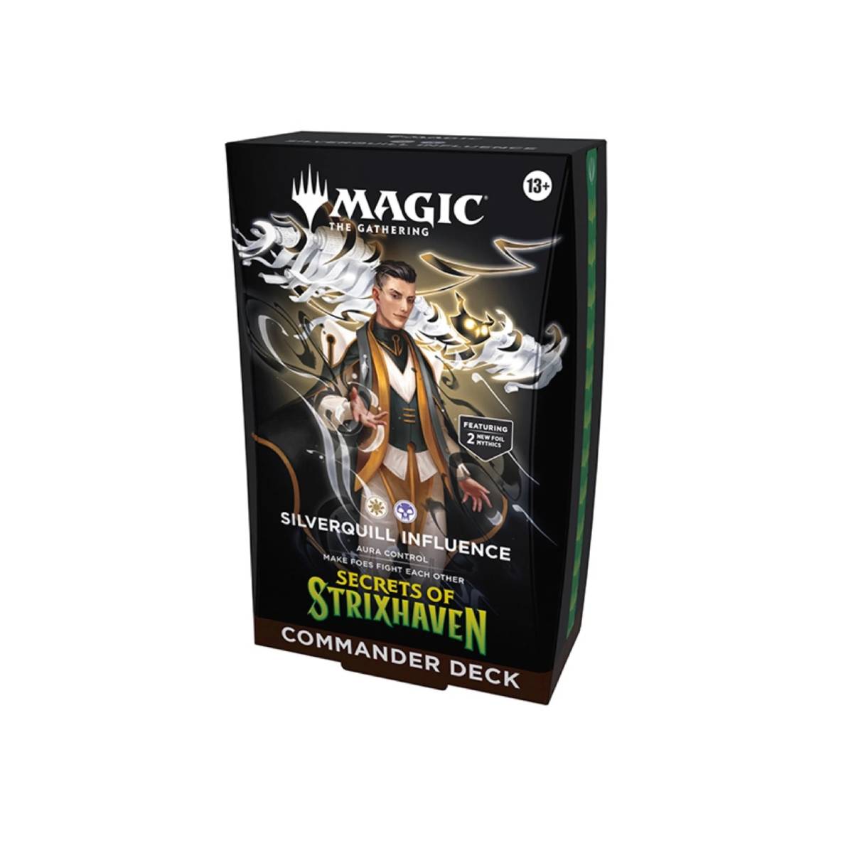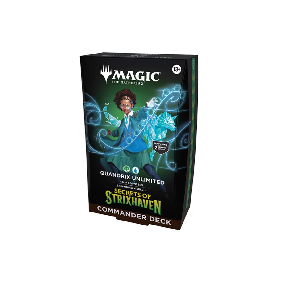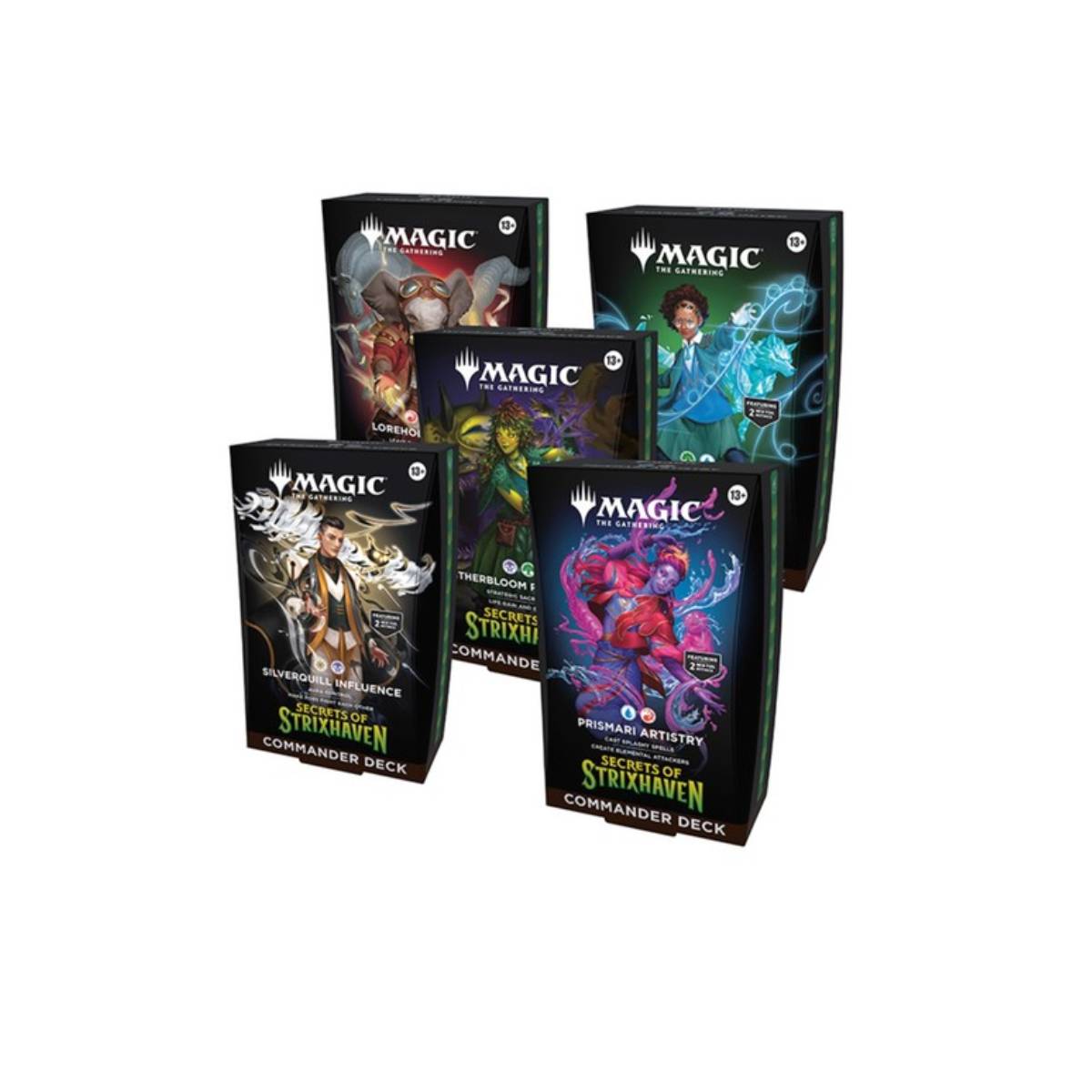 Explora el formato para varios jugadores más popular de Magic con cinco mazos de 100 cartas listos para jugar, cada uno con un estilo de juego bicolor único. Elige tu facultad de estudio de la magia y amplia tu educación en el gran mundo de Arcavios. Cada mazo de Commander de Secretos de Strixhaven incluye dos cartas de criatura legendaria raras míticas foil tradicionales con ilustraciones sin borde que puedes utilizar de comandante. Además, cada mazo incluye 12 cartas de Commander nunca vistas en Magic: The Gathering.