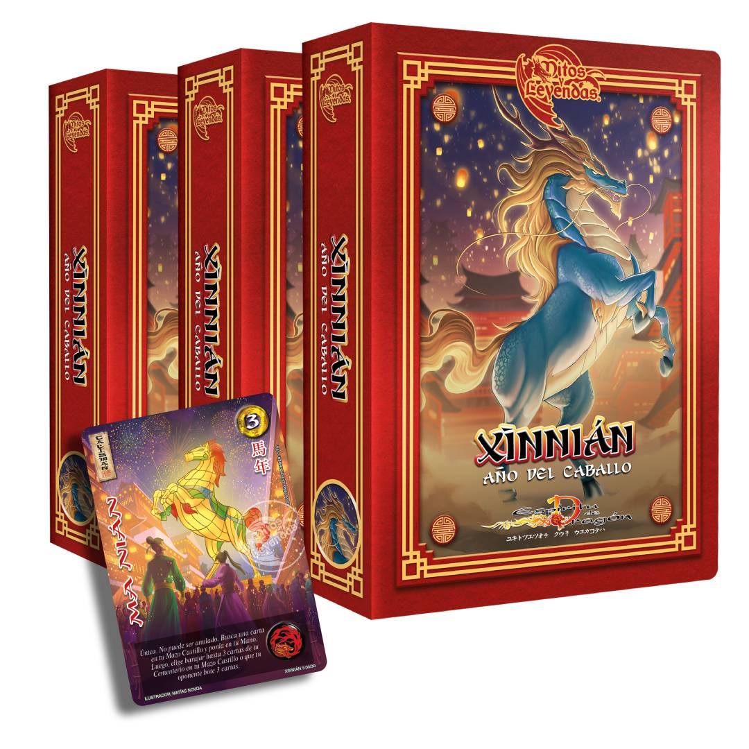 Llega la nueva entrega de la colección de Año Nuevo Chino para Mitos y Leyendas. Refuerza tus estrategias de Espíritu de Dragón con 18 cartas nuevas para las razas Xian, Kami, Campeón y Criatura. Este set especial incluye 12 Oros Básicos con arte premium del Zodiaco y 8 sobres de Leyendas Primera Era 4.0.