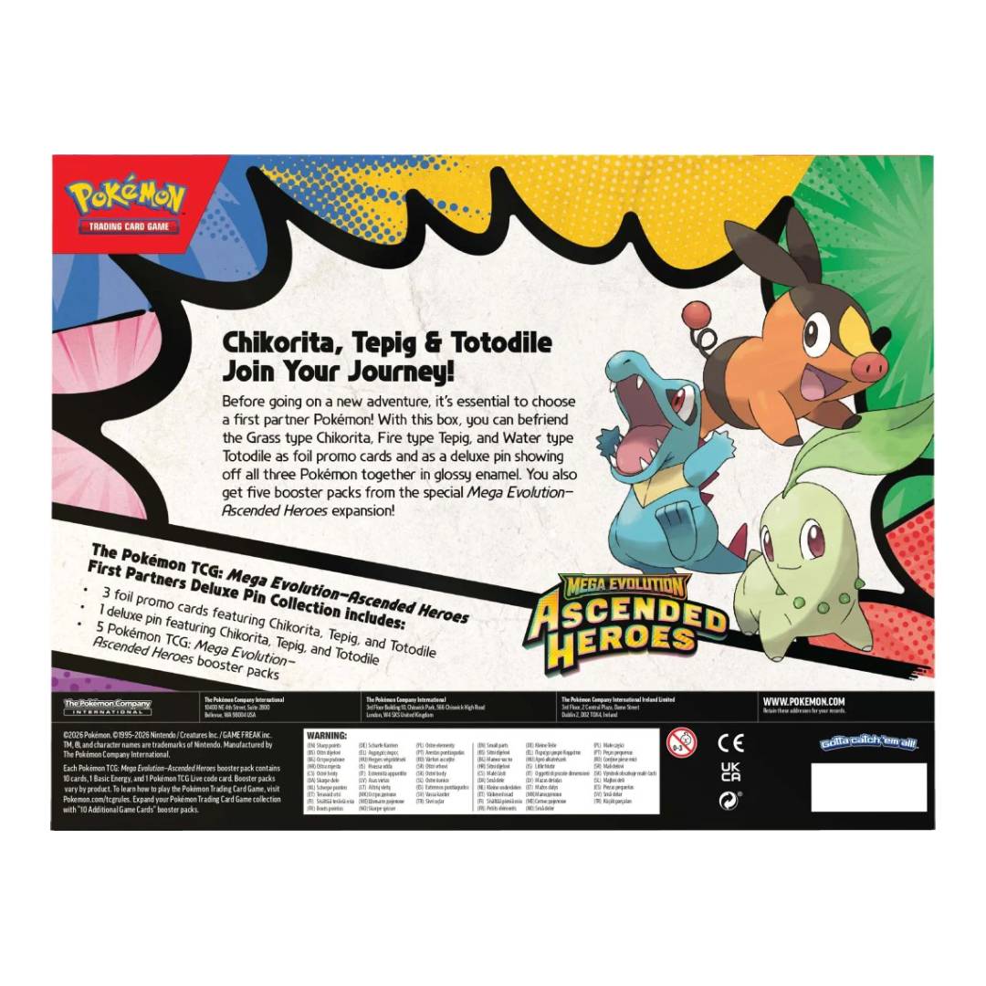 ¡Antes de emprender una nueva aventura, es esencial elegir un primer compañero Pokémon! En esta colección, el Pokémon de tipo Planta Chikorita, el de tipo Fuego Tepig y el de tipo Agua Totodile podrán acompañarte como cartas promo holográficas y en forma de 1 pin deluxe con acabado brilloso donde aparecen los tres Pokémon juntos. Además, ¡conseguirás 5 sobres de refuerzo de la expansión Megaevolución-Ascenso Heroico!