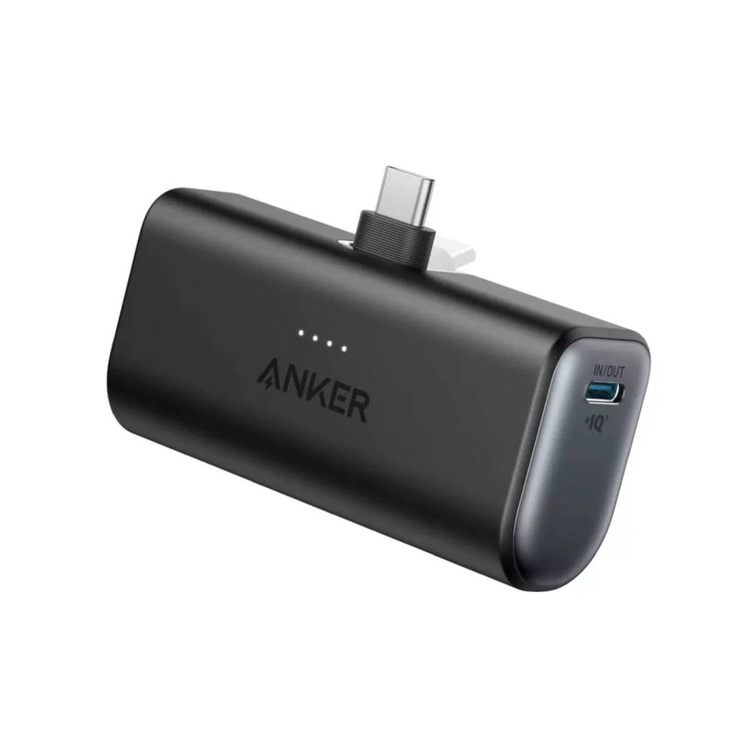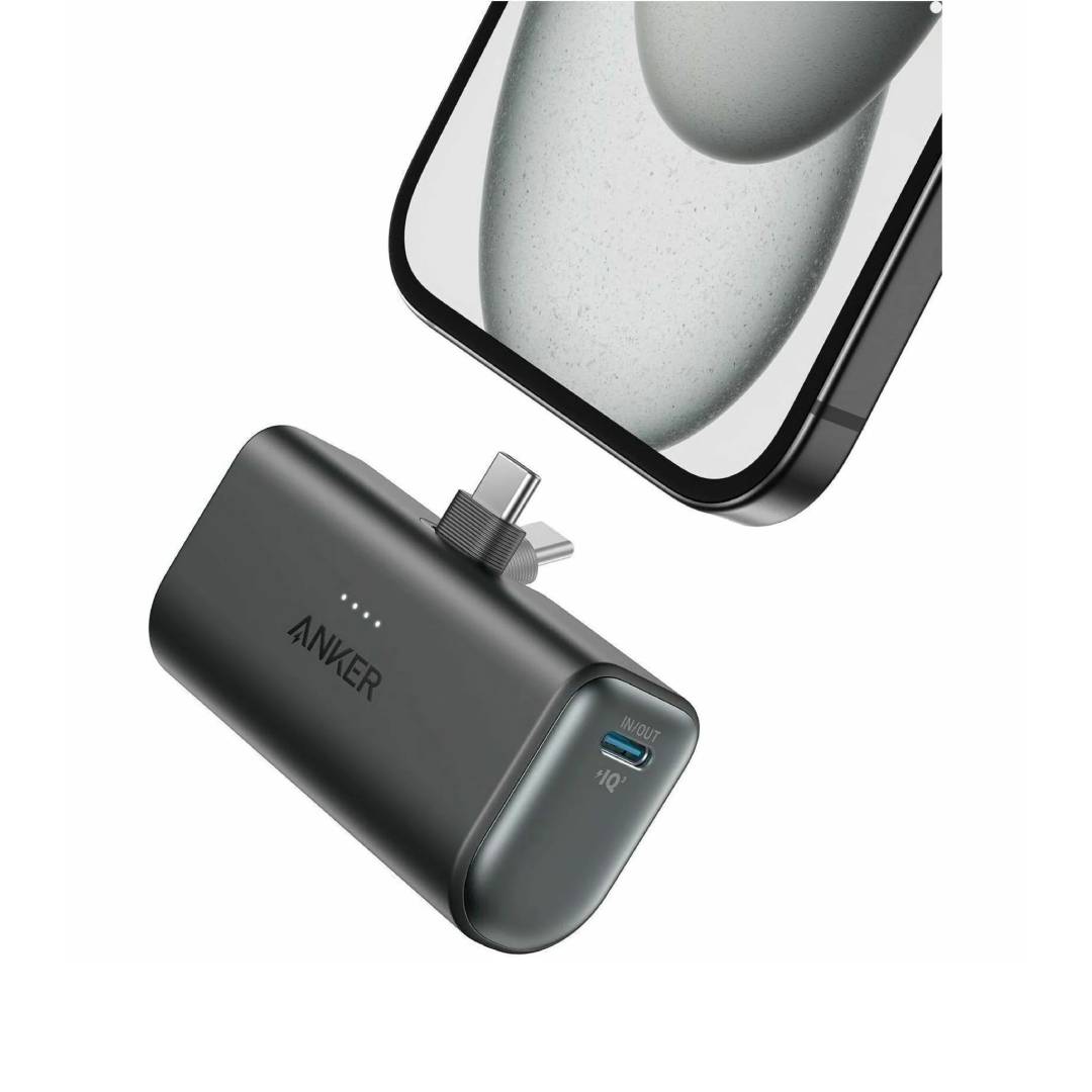 El Anker Nano Power Bank (Modelo A1653) en color negro es una batería externa ultra compacta diseñada para la máxima portabilidad, destacando por su conector USB-C plegable integrado que permite cargar dispositivos sin necesidad de cables adicionales.