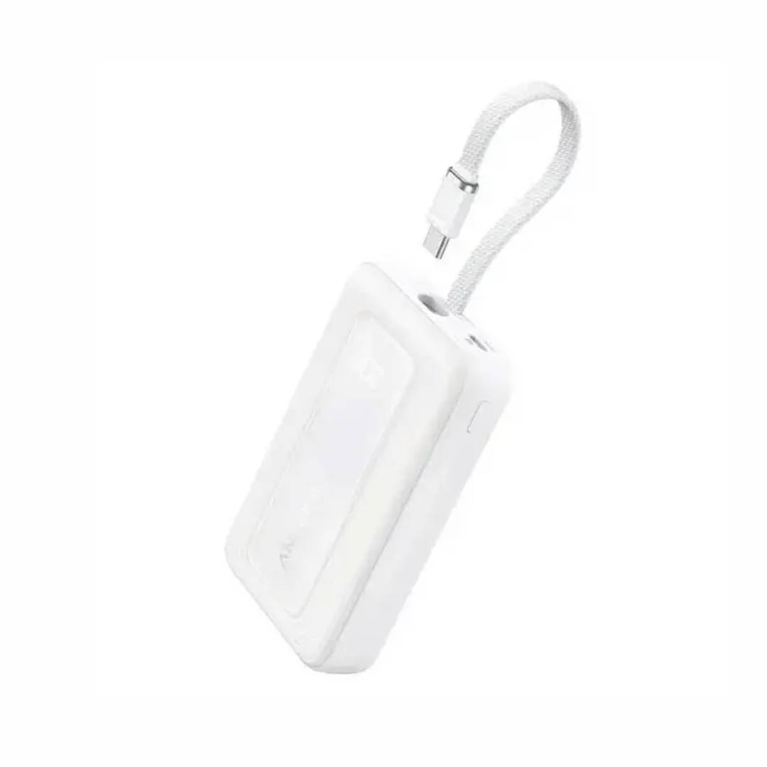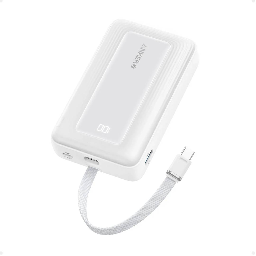 El Power Bank Anker Zolo (A1689) en color blanco es una batería externa de alta capacidad que destaca por incluir un cable USB-C integrado de alta durabilidad, diseñado para ofrecer una solución de carga «todo en uno» sin necesidad de cables adicionales.