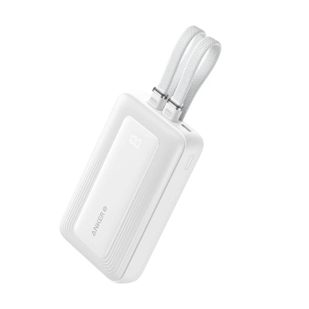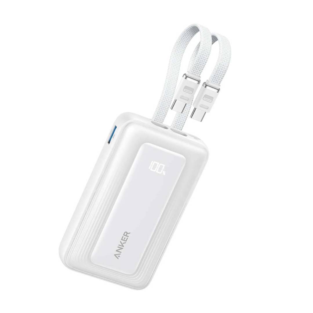 El Anker Zolo Power Bank 20,000mAh (A1681) en color blanco combina una estética limpia con una alta capacidad de energía y la comodidad de tener dos cables integrados (USB-C y Lightning), eliminando la necesidad de llevar accesorios adicionales.