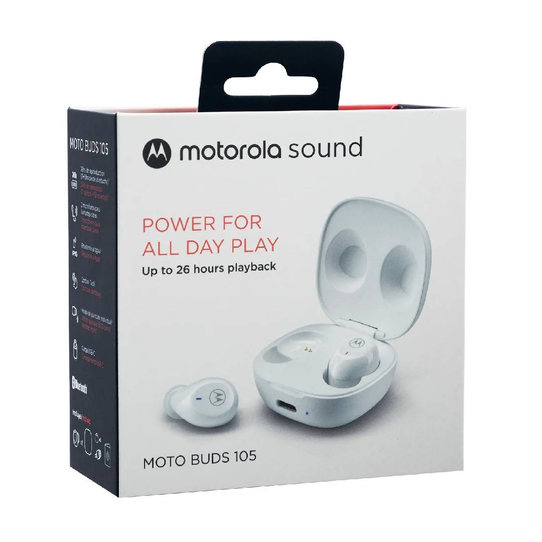 Los audifonos Motorola Moto Buds 105 True Wireless ofrecen una experiencia de audio inalambrica comoda y funcional para tu dia a dia. Con un diseno compacto y ergonomico, se ajustan perfectamente a tus oidos, brindando comodidad incluso tras varias horas de uso. Disfruta de llamadas nitidas y musica con buena calidad de sonido gracias a su tecnologia Bluetooth 5.0 y microfono integrado. Su estuche de carga portatil proporciona hasta 14 horas de autonomia total, ideal para acompanarte durante toda la jornada.