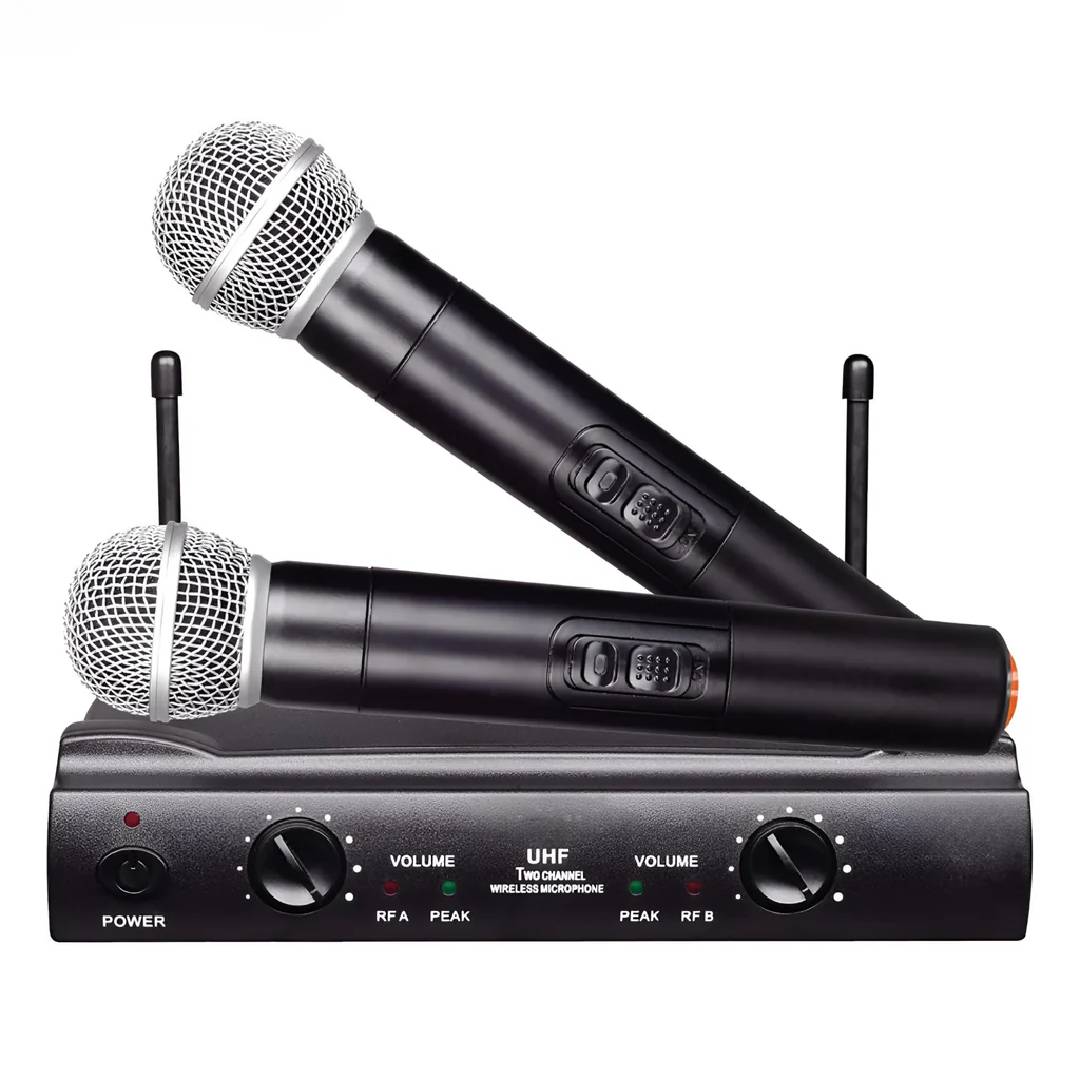 Set de dos micrófonos: El kit incluye dos micrófonos inalámbricos, perfectos para duetos, presentaciones grupales, o para cualquier evento que requiera la interacción de varias personas.