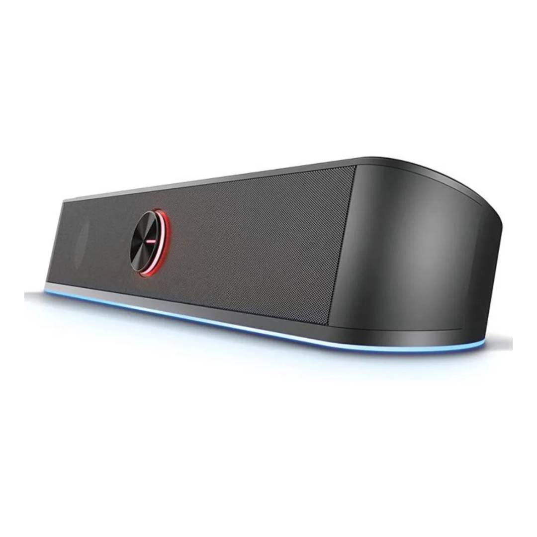 La barra de sonido HP DHE-6003 RGB está diseñada para mejorar la experiencia auditiva en juegos y multimedia, ofreciendo un sonido claro y potente junto con una atractiva iluminación RGB que realza el ambiente de tu setup. Su diseño compacto y moderno incorpora un botón táctil para controlar las luces y el volumen, facilitando su uso. Se conecta mediante un cable auxiliar de 3,5 mm, lo que la hace compatible con una amplia variedad de dispositivos que cuenten con esta entrada.