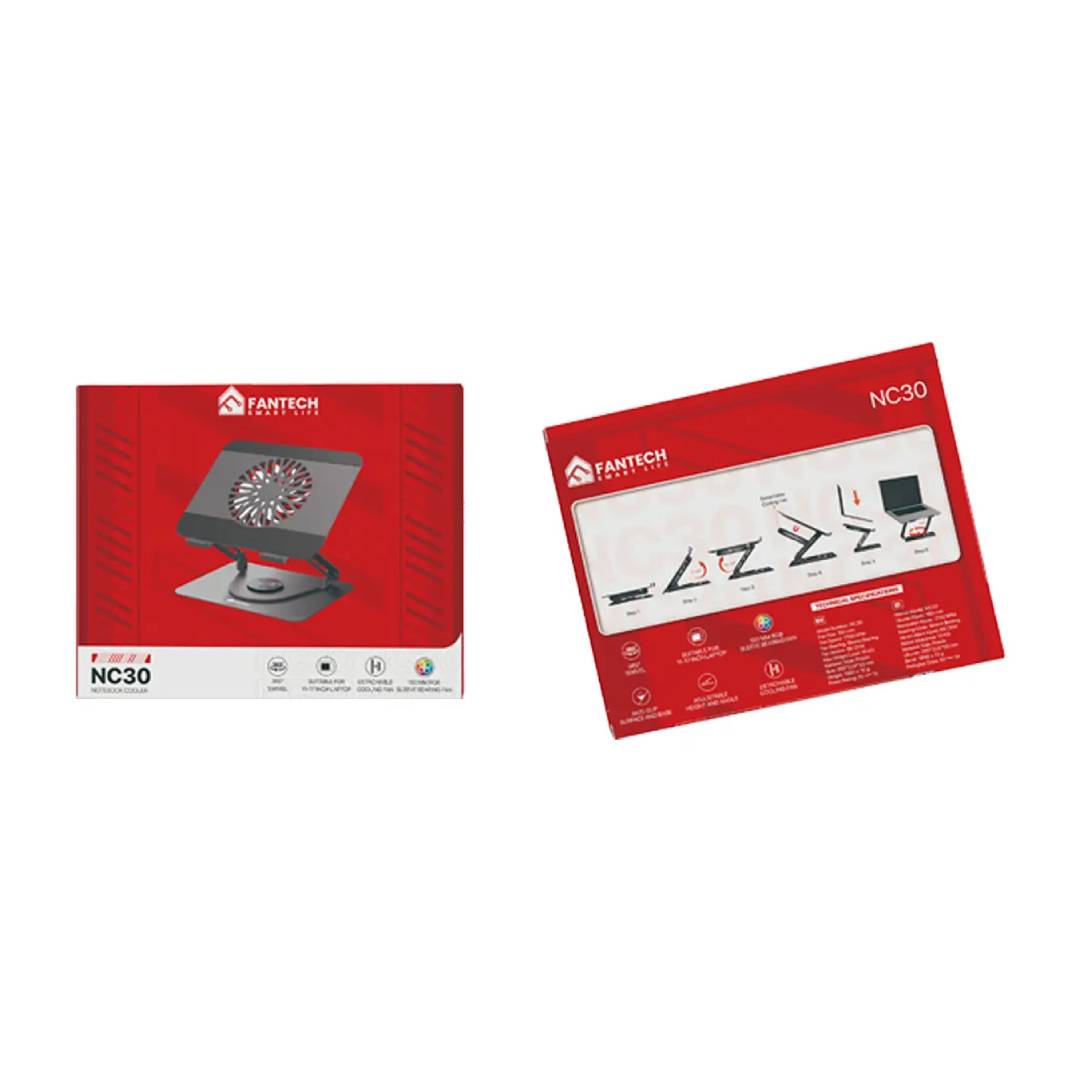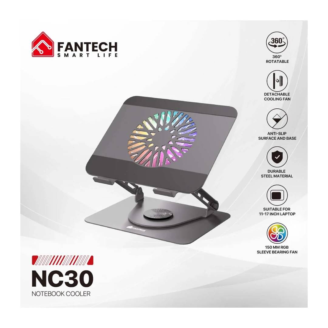 La FANTECH NC30 es la base que tu notebook necesitaba. Con ajuste total en 360 grados, altura regulable, superficie antideslizante y un ventilador RGB de 150 mm, está diseñada para mejorar tu postura, tu experiencia y la temperatura de tu equipo.